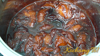 Garnek zdjąć z ognia i ostrożnie wlać wiśniówkę, wstawić ponownie na ogień(tym razem średni) i wrzucić śliwki. Dodać przyprawy i dusić 10-15 minut pod przykryciem, aż owoce zmiękną i częściowo się rozpadną, ostudzić.